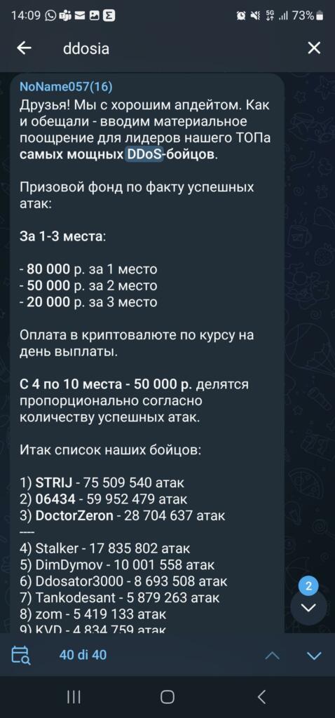 «Amici, eccoci con un buon aggiornamento. Come promesso, stiamo introducendo una ricompensa finanziaria per i leader dei nostri più potenti combattenti DDoS. Il premio in denaro si basa sugli attacchi riusciti: