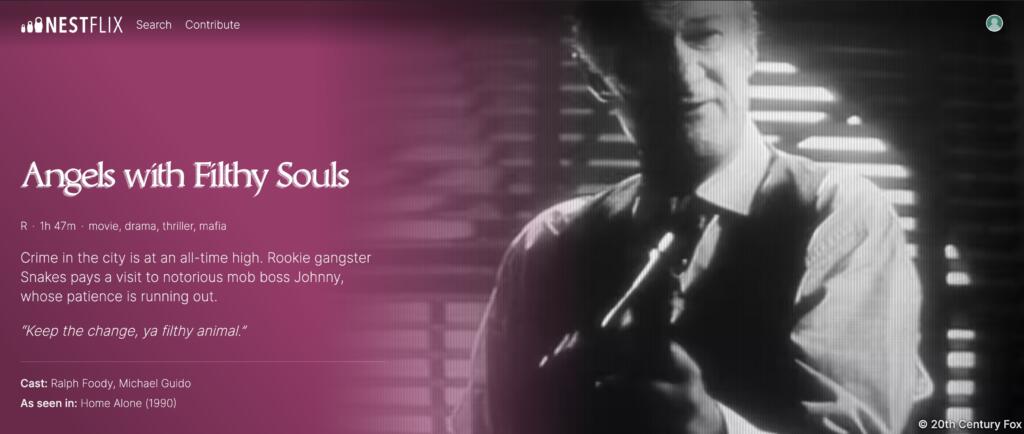 Il viaggio si snoda attorno a oltre 400 “titoli” di film che non esistono. L’obiettivo della piattaforma – oltre a essere una sorta di Wikipedia di “film nascosti” in altri film, con tutte le fattezze grafiche che ricordano da vicino Netflix – è quello di creare una libreria di pellicole che si vedono in altre pellicole e in cui gli stessi “protagonisti” dei film assumono il ruolo dello spettatore. Per esempio, tra i titoli inseriti, troviamo anche “Angel with Filthy Souls“. Di cosa parliamo?