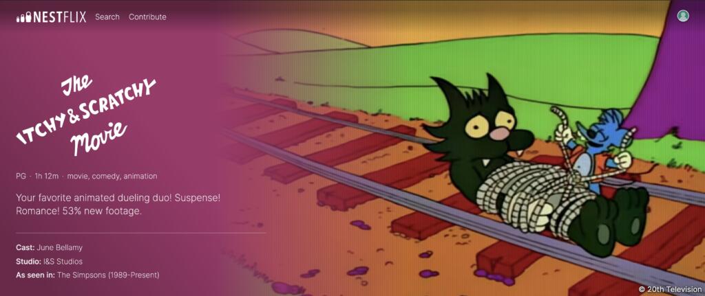 Cosa vuol dire? Chi è cresciuto negli anni Novanta con il mito dei Simpson, per esempio, conoscerà a menadito le puntate di “Grattachecca e Fichetto“: un cartone animato nel cartone animato. Insomma, Nestflix è una libreria di contenuti che offre allo spettatore le “risposte” sul suo ruolo da meta-spettatore. Cosa troviamo, dunque, sul sito?