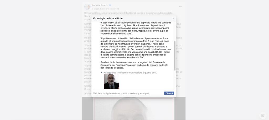 L’intervista a Rossano Rossi – sindacalista della Cgil di Lucca e storico delegato sindacale della Sammontana – è stata pubblicata da Il Tirreno lo scorso 6 giugno e, visto il tema trattato, ha avuto una vasta eco mediatica. Estratti sono stati ripresi da moltissime testate e da molti profili social. Tra questi ultimi c’è anche quello di Andrea Scanzi.