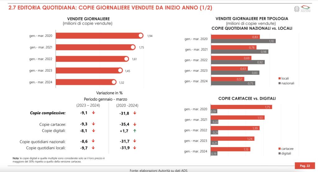 «In media, nel periodo gennaio-marzo 2024 giornalmente, sono state vendute 1,32 milioni di copie, in flessione su base annua del 9,1% e del 31,8% rispetto al 2020. Suddividendo la distribuzione tra testate nazionali e locali, con riferimento all’intero periodo analizzato (2020-2024), le vendite si sono ridotte in misura equivalente (31,7% le prime e 31,9% le seconde), mentre nel confronto con il primo trimestre 2023 i quotidiani locali hanno registrato una riduzione leggermente maggiore rispetto a quelli nazionali (-9,7% vs -8,6%). Le copie vendute giornalmente in formato cartaceo (1,13 milioni) su base annua si sono ridotte del 9,3% (risultavano pari a 1,24 milioni nel 2023) e del 35,4% rispetto al 2020 (quando ne venivano vendute giornalmente 1,75 milioni di copie)».