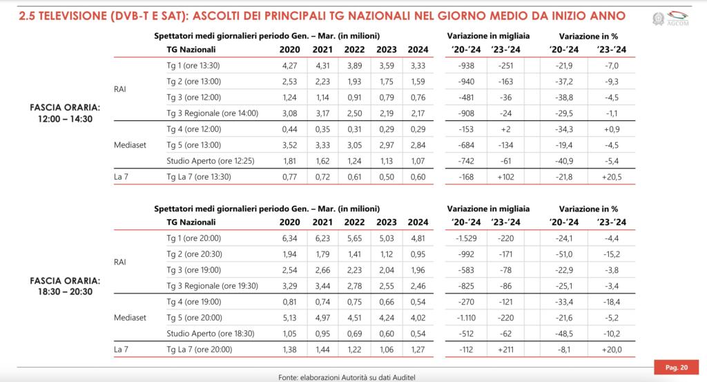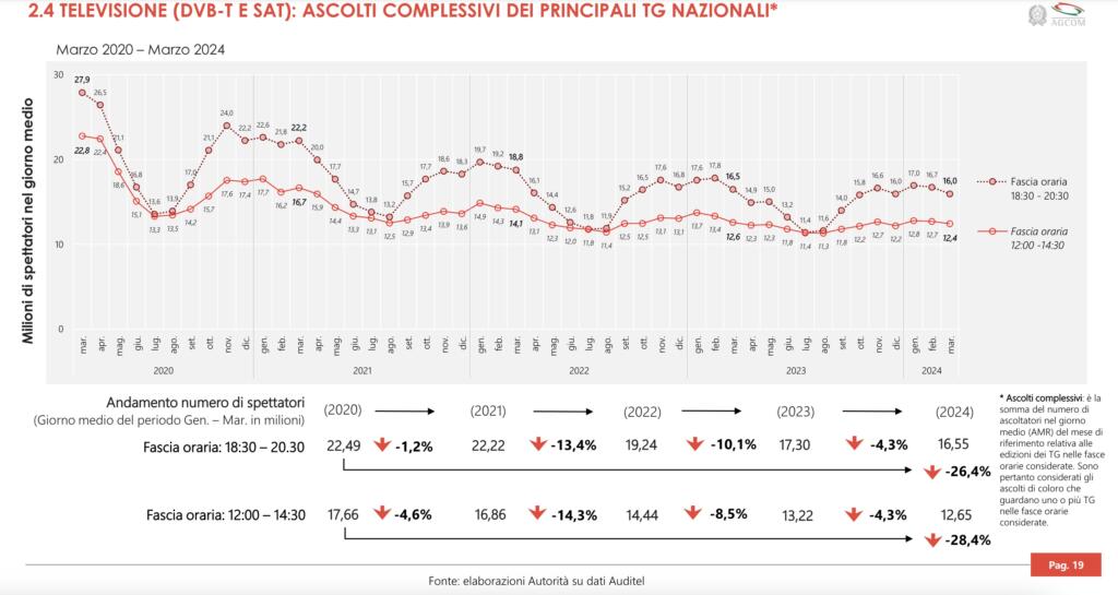 «Venendo agli ascolti delle edizioni dei principali telegiornali nazionali nel primo trimestre 2024 le edizioni serali (fascia oraria 18:30-20:30) mostrano, rispetto al 2023, una riduzione di circa 750 mila ascolti (da 17,30 a 16,55 milioni di spettatori)».