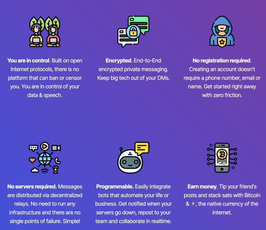 Twitter, all’apparenza. Ma princìpi di sviluppo e di funzione diametralmente opposti. Non è un caso che, infatti, il protocollo Nostr su cui si basano queste due applicazioni è stato più volte etichettato come lo strumento per mettere la parola fine a Twitter e ai social network come li abbiamo conosciuti (e utilizzati) fino a oggi.