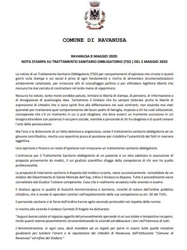 Il Comune di Ravanusa, in sintesi, sostiene che la decisione di sottoporre sia stata presa dai medici, come da protocollo e che Dario Musso non sia stato sottoposto a TSO per «comportamenti d’opinione». La vicenda, però, non si spegnerà con questo comunicato stampa.