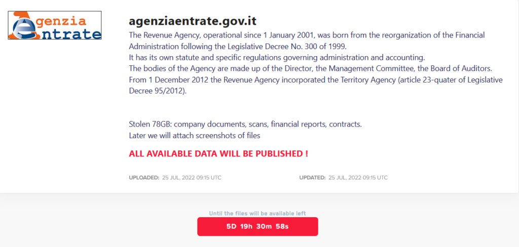 LEGGI ANCHE >>> Tra 5 giorni, LockBit pubblicherà i dati rubati all’Agenzia delle Entrate