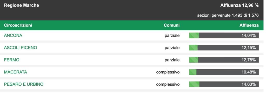 I dati verranno aggiornati nel tardo pomeriggio di oggi con i numeri raccolti dai vari comuni nel corso della giornata di domenica. Come da tradizione, i prossimi dato saranno resi noto intorno alle ore 19 e dopo le 23. Prima del completamento delle operazioni di voto di lunedì 21 settembre.