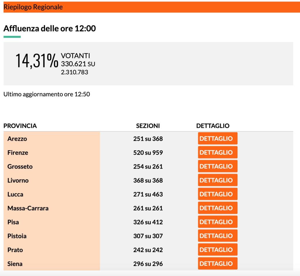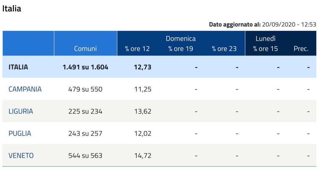 Sul sito del Ministero dell’Interno compaiono i dati affluenza ore 12 solamente per quel che riguarda sei Regioni (Veneto, Puglia, Campania e Liguria).
