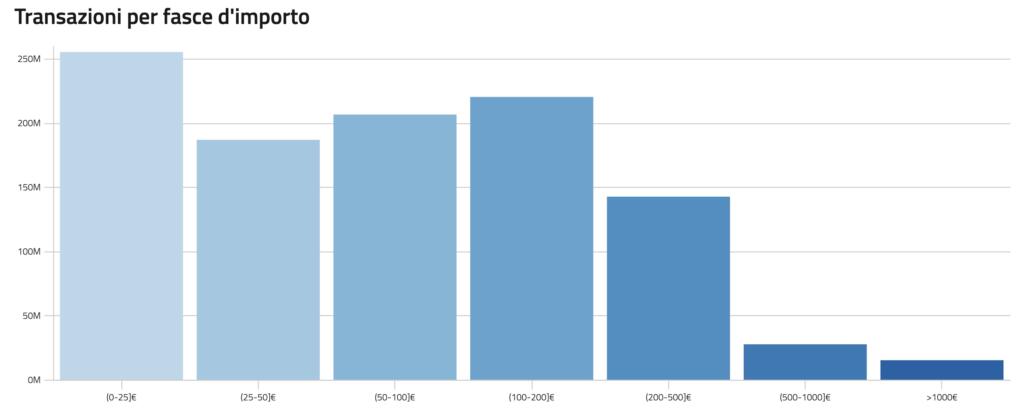 Altro aspetto interessante che emerge dai dati PagoPA è quello sulla cifra media spesa per ogni transazione. Dal 2016 a oggi, questo quota si attesta sui 203 euro. La maggior parte degli italiani utilizza il servizio per effettuare dei pagamenti fino a 25 euro, seguiti dalla fascia 100-200 euro, 50-100 euro, 15-50 euro e 200-500 euro. Residuale l’utilizzo per quel che riguarda pagamenti o versamenti più elevati (a partire dai 500 euro).