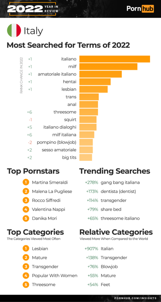 I numeri più emblematici riguardano l’aumento percentuale delle ricerca per determinate categorie. In particolare, la parte relativa alle orge (italiane) e ai transgender hanno segnato dei picchi di ricerca mai visti prima.