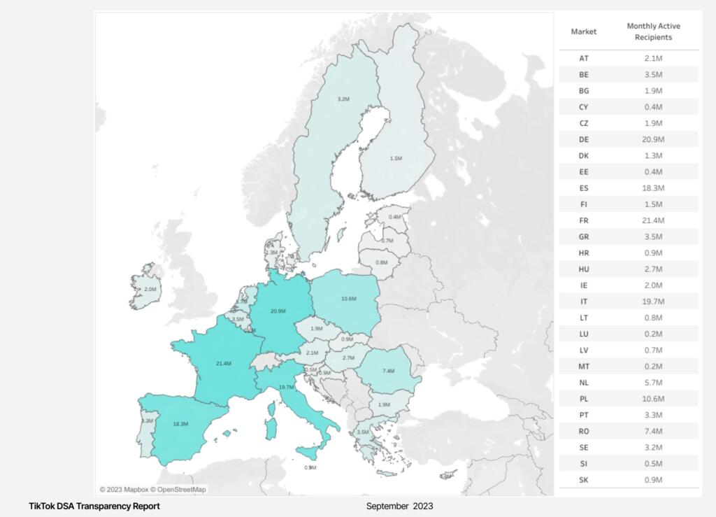 Presi singolarmente, infatti, i dati utilizzo TikTok in Europa sono di gran lunga inferiore rispetto a quelli di altri Paesi del mondo. Secondo quanto pubblicato – come previsto dal DSA – nel report sulla trasparenza inviato alla Commissione Europea nel settembre dello scorso anno, la Francia ha 21,4 milioni di utenti attivi. Dietro di lei c’è la Germania (20,9 milioni) e l’Italia (19,7 milioni). In quarta posizione c’è la Spagna (18,3 milioni).