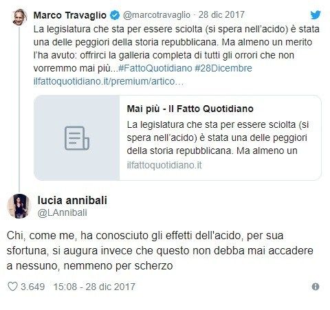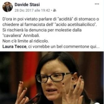 «Non ho mai voluto ironizzare su Lucia Annibali – ha spiegato Davide Stasi a Giornalettismo -. Quel post si inseriva in un discorso molto più ampio: una critica alla deputata che aveva strumentalizzato la sua tragedia personale per entrare in una diatriba social con Marco Travaglio che in un suo editoriale aveva utilizzato il parlato di una legislatura ‘che sta per essere sciolta, speriamo nell’acido’. E a questo post del giornalista del Fatto Quotidiano, Lucia Annibali aveva replicato riportando in auge la sua tragedia personale».