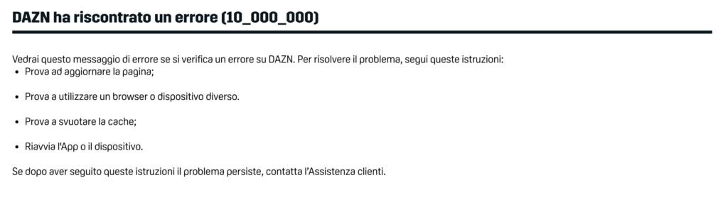 Chi era loggato non poteva accedere all’evento selezionato. Chi doveva loggarsi, invece, veniva rimbalzato dietro pagine di errori dai più svariati numeri (il più diffuso è il 10-000-000), che Dazn descrive così.