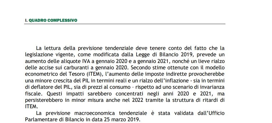 «La lettura della previsione tendenziale deve tenere conto del fatto che la legislazione vigente, come modificata dalla Legge di Bilancio 2019, prevede un aumento delle aliquote Iva a gennaio 2020 e a gennaio 2021, nonché un lieve rialzo delle accise sui carburanti a gennaio 2020», si legge a pagina 5 del Def nel capitolo dedicato allo ‘Scenario macroeconomico e finanza pubblica tendenziali’. Ovviamente, come si può comprendere dalle parole scritte nel testo, si tratta di una previsione che tiene conto solamente della legislazione vigente.