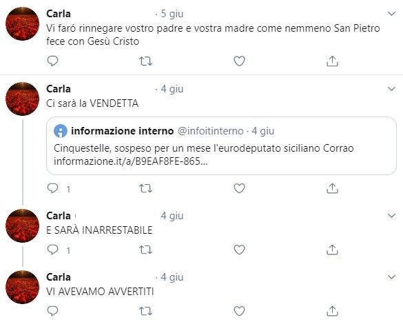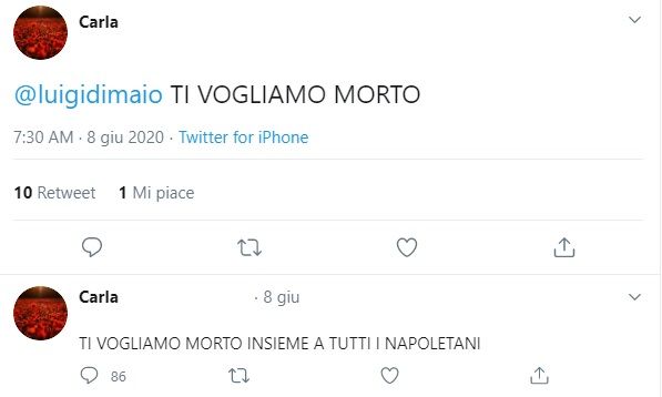 Tra i tweet condivisi da questo account, ne troviamo molti di minacce nei confronti dell’attuale maggioranza di governo. Dal «Luigi Di Maio ti vogliamo morto», al «Ti vogliamo morto insieme a tutti i napoletani». Scorrendo tra gli ultimi post condivisi da questa Carla, troviamo altri pensieri poco consoni all’ambiente social: «Vi ammazzeranno, vi ammazzeranno tutti».