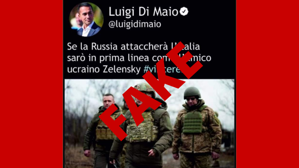 Molti profili social lo hanno condiviso accompagnandolo con questo testo: «Ma si può essere così stupidi?». La vera domanda è: ma si può essere così ingenui dal condividere un evidente foto-montaggio di cui non vi sono ulteriori tracce online e dare vita al solito can can mediatico? Perché da un paio di giorni sta circolando su Twitter (e ripreso anche da alcuni siti, non organi di informazione) un presunto post (non) pubblicato da Luigi Di Maio. Si parla di una sua presenza in prima linea in caso di attacco russo all’Italia, sul modello Zelensky. Ovviamente queste parole non sono mai state scritte, né pronunciate dal numero uno della Farnesina.