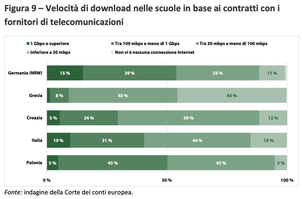 Come si può leggere dal grafico pubblicato dalla Corte dei Conti europea, la situazione non è ottimale per nessuno dei cinque Paesi oggetto dell’audit. Ovviamente, però, dobbiamo concentrarci sull’Italia e sulla digitalizzazione Scuola. Solamente il 10% degli istituti scolastici ha una connettività pari o superiore a 1 Gigabit al secondo. Dunque, solo una scuola su dieci è in linea con quell’obiettivo indicato dall’Europa entro il 2025 e rimodulato per l’Italia al 2026. Dunque, come confermato dal grafico, sono molte più le scuole che hanno una connessione a Internet lenta (il 15%) rispetto a quelle che ne hanno una ultra-veloce.