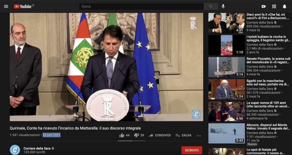 «Quirinale, Conte ha ricevuto l’incarico da Mattarella: il suo discorso integrale». Insomma, sembra essere un qualcosa in diretta – o quasi – e questo sembra essere confermato andando a cliccare sul link condiviso dal Corriere della Sera che rimanda al proprio canale Youtube.