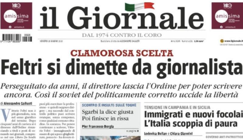 Il battitore Libero per eccellenza non potrà più essere direttore editoriale di Libero Quotidiano. Ad annunciare la clamorosa svolta delle dimissioni Feltri dall’ordine dei giornalisti è Alessandro Sallusti che dedica a questa notizia la prima pagina dell’edizione odierna de Il Giornale, accompagnata da un lungo editoriale. L’annuncio ufficiale arriva, dunque, non dalla voce del diretto protagonista che oggi, invece, dedica un commento al fatto che gli italiani non sappiano comprare, ma dal suo collega.