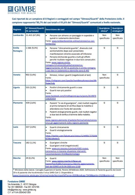Tutti questi dati, che mettono in evidenza la discrepanza dimessi-guariti, portano la Fondazione Gimbe di Bologna a chiedere alla Protezione Civile una modifica del loro modo di comunicare e di attuare un piano unico di comunicazione durante questa emergenza: