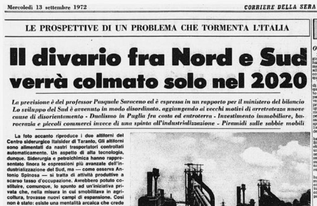 In edicola, la mattina del 13 settembre del 1972, sul Corriere della Sera era stato pubblicato questo articolo che, nella sua attualità non più attuale, voleva essere una previsione economica sul superamento della distonia tra il Settentrione e il Meridione. Nessuna lotta campanilistica, ma veggenze che si basavano su opere da compiere in questo lungo lasso di tempo. Il tutto, ovviamente, è stato disatteso.