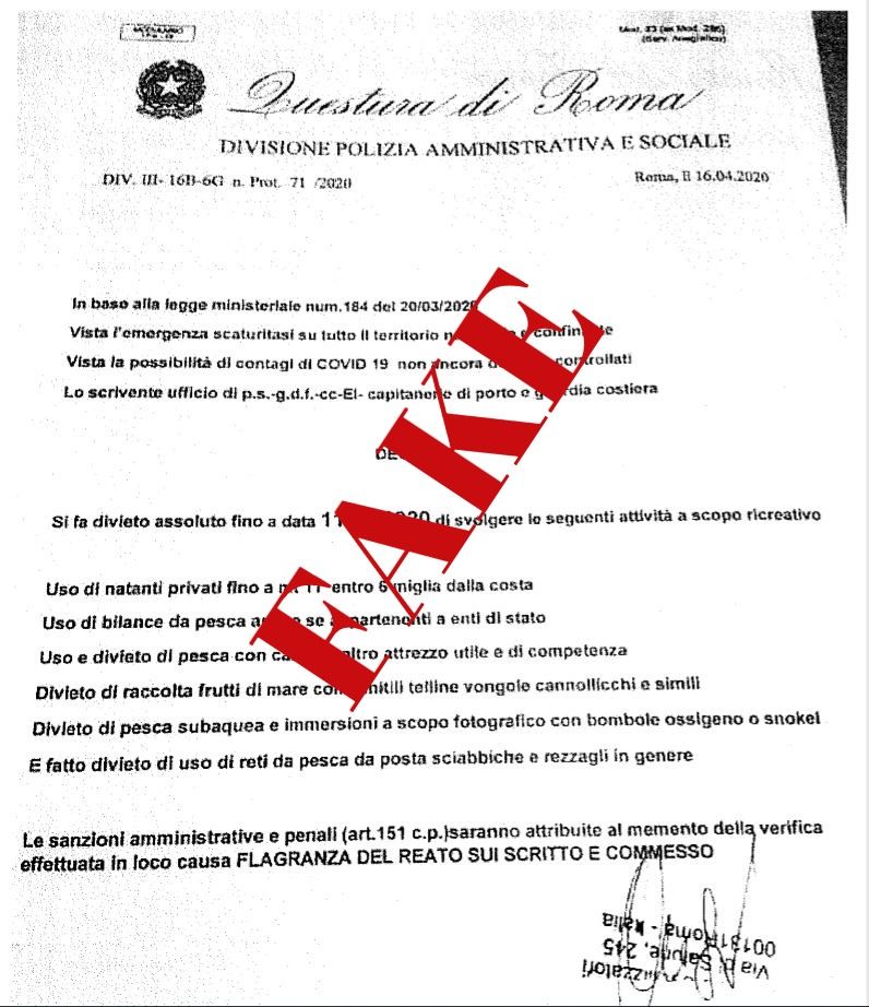 Gli errori grammaticali erano già il sintomo della fake news. Bufala confermata dalla stessa Questura di Roma: «La Polizia di Stato non riconosce come proprio un documento diffuso su internet riguardante il divieto di svolgere attività balneari a scopo ricreativo. Nelle ultime ore sta girando su internet un documento con intestazione ‘Questura di Roma-Divisione Polizia amministrativa e sociale’, riportante il logo della Repubblica Italiana, con il quale, unitamente a Guardia di Finanza, Carabinieri, Esercito Italiano, Capitaneria di Porto e Guardia Costiera, si farebbe divieto, a causa di possibilità di contagi Covid 19, di svolgere diverse attività balneari a scopo ricreativo fino all’11 giugno 2020. Quanto riportato su tale documento è da ritenersi falso ed ingannevole per la pubblica fede e non deve essere preso in considerazione».
