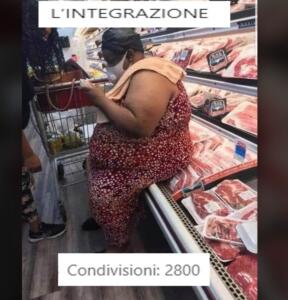 Vi parliamo di una foto, pubblicata da un profilo privato l’11 agosto 2020, che è stata condivisa migliaia di volte, e che ritrae una donna di colore, evidentemente in sovrappeso, seduta su un frigo delle carni mentre legge l’etichetta della confezione di un prodotto.
