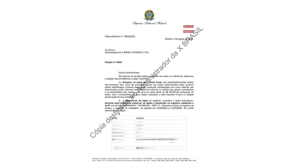 Si tratta di un documento riservato inviato agli uffici di X in Brasile ad aprile, all’inizio di questa indagine. Giornalettismo ha deciso di oscurare i nominativi presenti, in quanto vi era un riferimento diretto al nome utente collegato all’identità reale di chi utilizzava questi profili. Anzi, in un altro post è stato pubblicato anche un altro documento in cui vengono svelati anche altri dettagli (la professione o il ruolo nella società civile, per esempio) relativi a queste persone. Invece, X ha pubblicato tutto integralmente, mostrando i nomi. Si tratta, dunque, di quello che in gergo viene definito “Doxxing” di X, ovvero la condivisione dei documenti in cui sono presenti dati altrui.