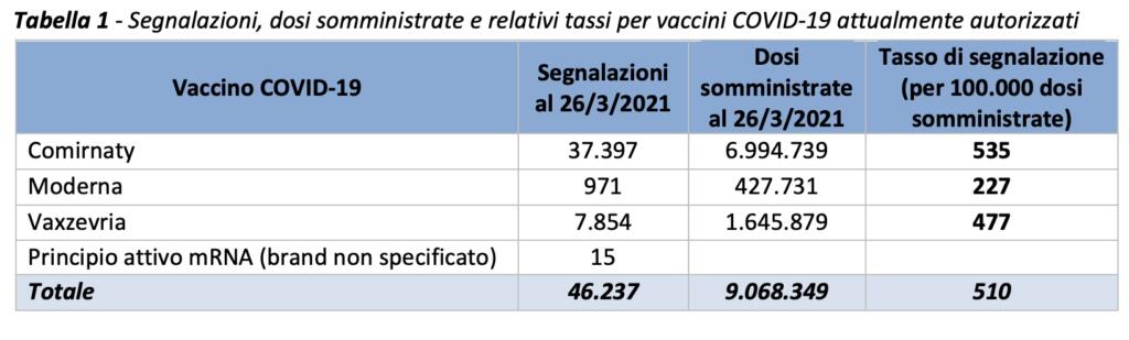 L’ultimo (in ordine cronologico) rapporto dell’Agenzia Italiana del Farmaco ha raccolto tutte le segnalazioni – nell’ambito della farmacovigilanza continua – arrivate dal 27 dicembre scorso (giorno in cui è iniziata la campagna di vaccinazione in Italia e in Europa) al 26 marzo. I primi tre mesi iniziati con le somministrazioni dei prodotti di Pfizer-BioNTech – denominato Comirnaty ((autorizzato dal 22/12/2020 e utilizzato dal 27/12/2020) – e di Moderna (autorizzato dal 07/01/2021 e utilizzato dal 14/01/2021). Si tratta di due vaccini creati con la tecnologia mRNA (RNA messaggero). A loro, nel giro di un mese, si è aggiunto il vaccino AstraZeneca – ora denominato Vaxzevria (autorizzato dal 29/01/2021 e utilizzato dal 01/02/2021) -, in attesa delle ulteriori verifiche dell’EMA (Agenzia Europea del Farmaco) sul già approvato vaccino Janssen prodotto da Johnson&Johnson.