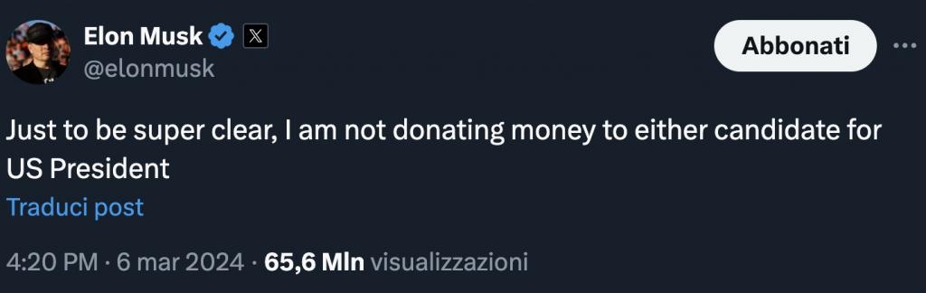 Poco prima di acquistare la piattaforma aveva sottolineato questa esigenza, per poi dire che non avrebbe mai finanziato alcun candidato. Ora tutto è cambiato