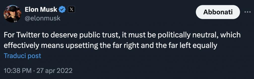«Affinché Twitter meriti la fiducia del pubblico, deve essere politicamente neutrale, il che significa effettivamente turbare allo stesso modo l’estrema destra e l’estrema sinistra». Dunque, più che di atteggiamento “apolitico” Musk parlava di “equidistanza” e neutralità rispetto alle correnti politiche. Un post invecchiato malissimo nel giro di un paio di anni. E questo fa il paio con quanto dichiarato – sempre sulla sua piattaforma, oggi chiamata X – nel marzo scorso.