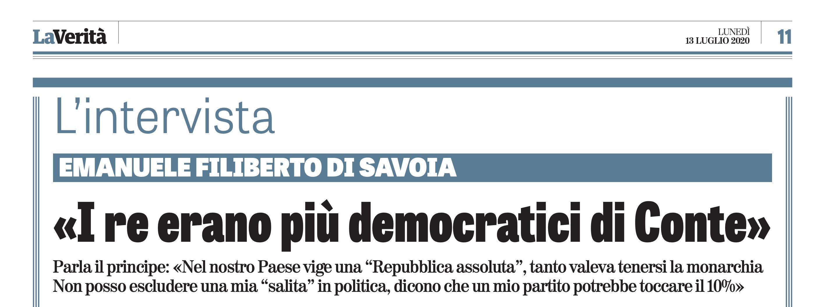 Anche se La Verità, che ha realizzato questa intervista, titola con un roboante «I re erano più democratici di Conte», trasformando la sintesi giornalistica in sovranismo populista – molto apprezzato dai suoi lettori -, l’erede di Casa Savoia ha fatto un discorso molto preciso parlando dei costi della politica e del passaggio da una Monarchia Costituzionale a una Monarchia Assoluta (per poi correggere il titolo parlando di Repubblica Assoluta).