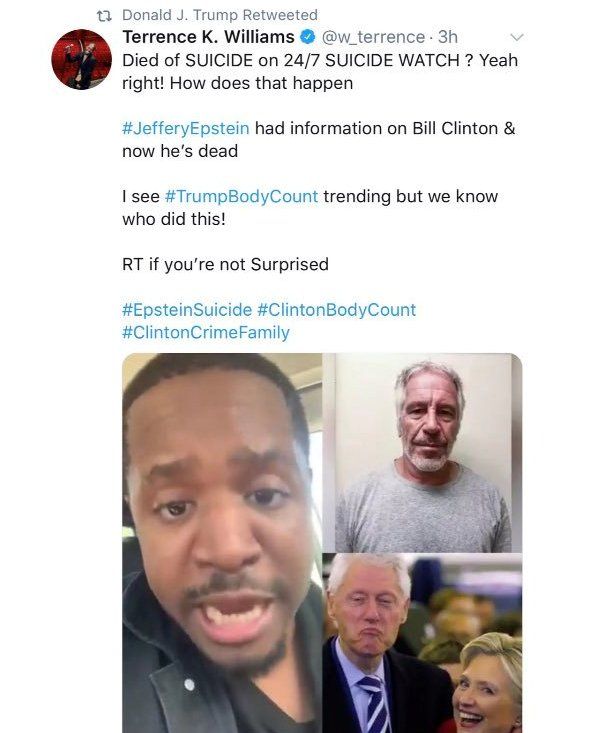 «Morto suicida il 24/7? Sì, come no! Come è potuto accadere? Jeffery Epstein aveva informazioni su Bill Clinton e ora è morto, vedo #TrumpBodyCount di tendenza ma sappiamo chi è stato! RT se non sei sorpreso», recita il tweet del comico Terrence K. Williams ricondiviso sulla sua bacheca dal numero uno della Casa Bianca. Insomma, il tycoon statunitense segue la linea delle teorie cospirazioniste dietro la morte del finanziere che, secondo le accuse che stanno circolando sul web, aveva informazioni scottanti su Bill Clinton.