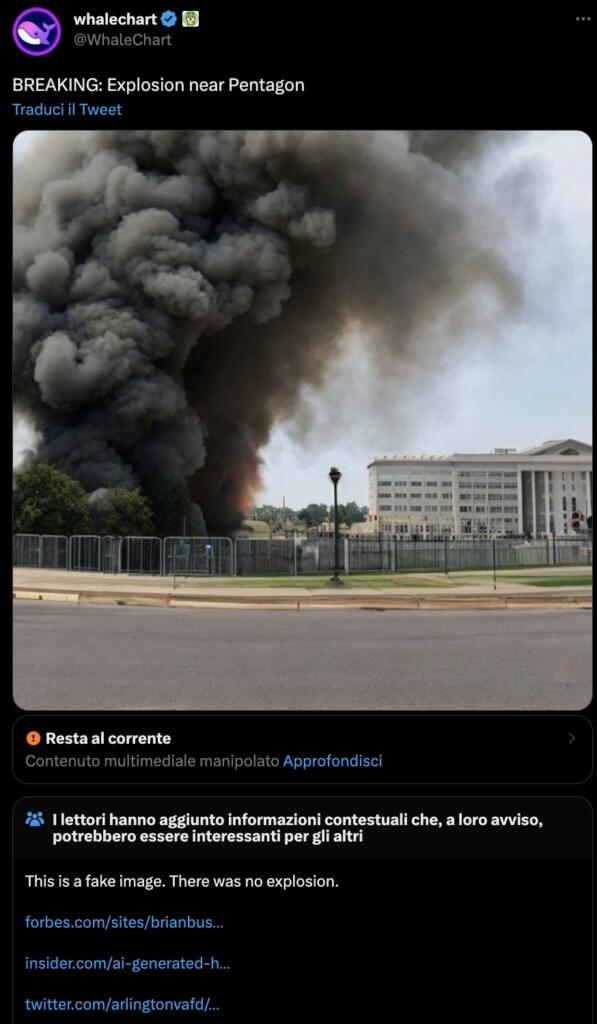 E questa attenzione mediatica – impercettibile in Italia – ha provocato anche una lieve flessione a Wall Street. Perché, la storia della Borsa insegna, ogni qualvolta accade un fatto di cronaca importante, i mercati entrano in fibrillazione e gli andamenti cambiano di minuto in minuto. Ovviamente la flessione non è stata importante, ma sintomatica ci quanto una fake news, come quella dell’esplosione al Pentagono (smentita persino dai Vigili del Fuoco di Arlington, in Virginia), produca dei riflessi dannosi per tutte le sfaccettature dell’ecosistema.