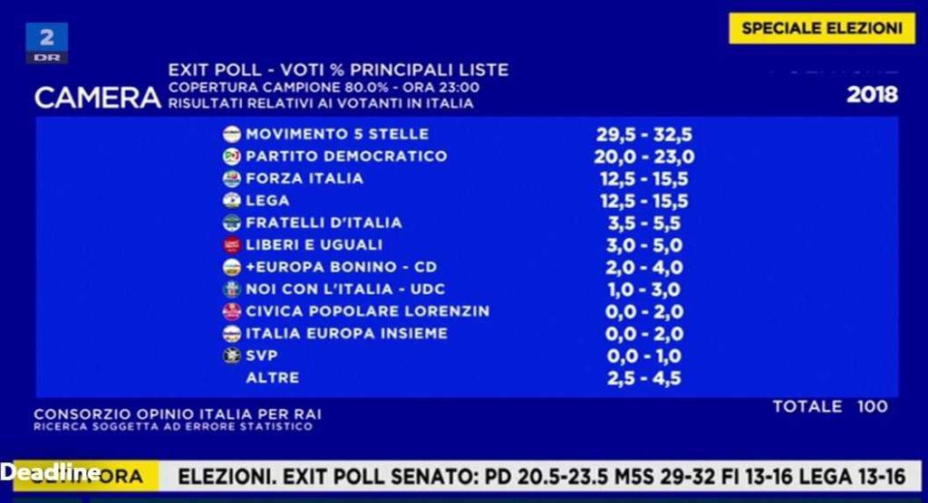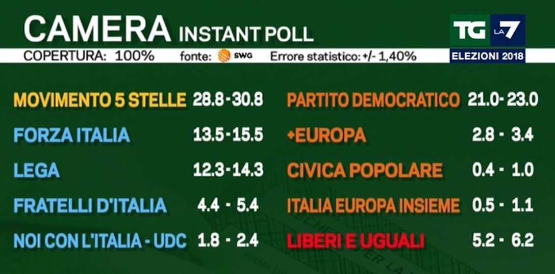 I primi exit poll di La7 Su un campione di 5 mila lettori – SWG/La7 movimento 5 stelle 28.30.8, Forza Italia 13.5 -15.5 Lega 12.3-14.3 Fdi 4.4 -5.4 Noi con L’italia 1.8 -2.4 Pd 21-23 Più Europa 2.8 -3.4 Civica Popolare 0.4 -1 Liberi E Uguali 5.2. – 6.2 PaP 1.4 – 1,2 CasaPound 0.3 -07