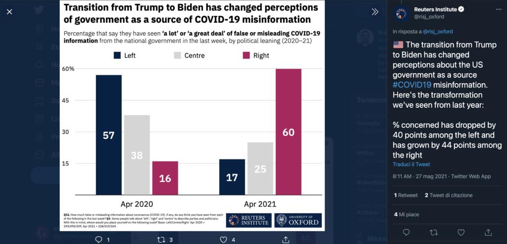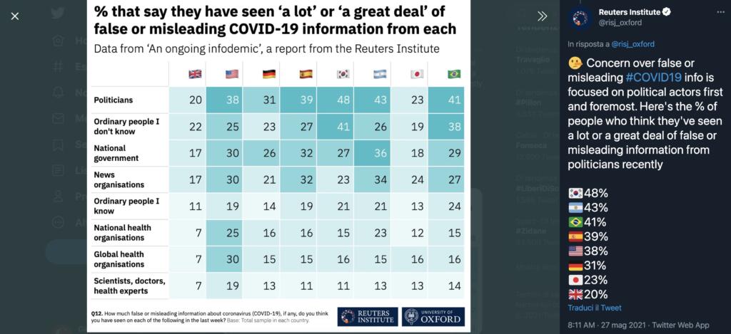Buona parte della disinformazione sul Covid, secondo le risposte date dagli intervistati, è arrivata dai politici. In particolare, in Brasile, Argentina e Corea del Sud. Il discorso si sposta anche sugli Stati Uniti, ma dal cambio di guida alla Casa Bianca la percezione è cambiata in modo radicale, con la comunicazione di Trump giudicata in modo molto negativo rispetto a quella di Biden.