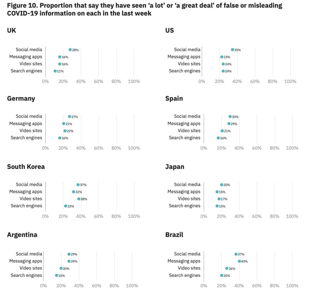 “In termini di piattaforme, la preoccupazione del pubblico per informazioni false o fuorvianti su COVID-19 è incentrata sui social media. In media, il 30% afferma di pensare di aver visto ‘molte’ o ‘molte’ informazioni false o fuorvianti sul coronavirus sui social media”, si legge nella sinossi del report.