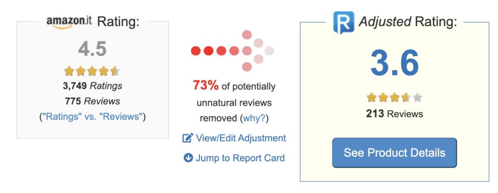 Nel caso specifico, vediamo il risultato. Su Amazon il rating era di quattro stelle e mezzo, frutto di 775 recensioni e 3.749 valutazioni. Di queste, secondo l’algoritmo statistico di ReviewMeta, il 73% è risultato potenzialmente innaturale (non veritiero). Tutto ciò porta a un declassamento della valutazione: prendendo per buone solamente le recensioni ritenute naturali e veritieri, il rating passa da 4,5 a 3,6.