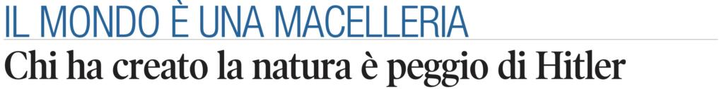 Il suo spunto – una blasfemia per i credenti – parte da un libro che ha letto pochi giorni fa: ‘Lettere dalla fine del mondo’, scritto a quattro mani da firmato Massimiliano Parente e dallo scienziato Giorgio Vallortigara. E, dopo averlo letto, Feltri ha tratto le sue conclusioni. Parla di tutti i mali che condizionano il mondo: terremoti, calamità e coronavirus, per fare solo alcuni esempi. E da lì arriva alla conclusione blasfema: «Se fosse vero che c’è un creatore il quale ha progettato e realizzato un mattatoio come quello nel quale tiriamo a campare ogni dì, bisognerebbe concludere che Hitler al suo confronto era un angioletto».