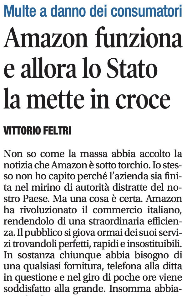 «Amazon ha rivoluzionato il commercio italiano – scrive Vittorio Feltri -, rendendolo di una straordinaria efficienza. Il pubblico si giova ormai dei suoi servizi trovandoli perfetti, rapidi e insostituibili. In sostanza chiunque abbia bisogno di una qualsiasi fornitura, telefona alla ditta in questione e nel giro di poche ore viene soddisfatto alla grande».