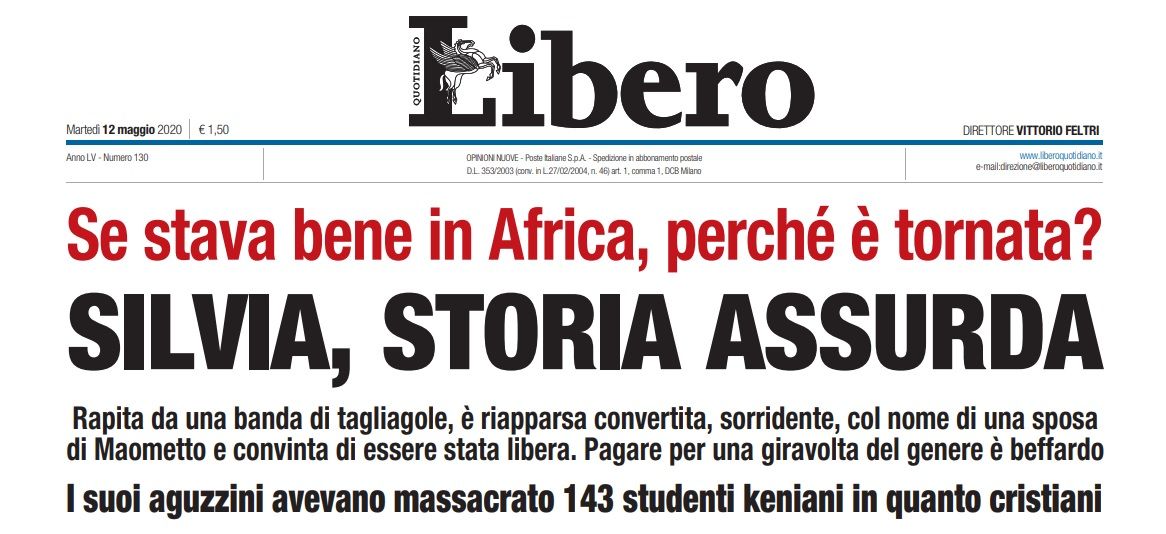Nella giornata di lunedì sia Libero che Il Giornale hanno prodotto due prime pagine alquanto contestabili in merito al ritorno in Italia di Silvia Romano. Oggi il quotidiano diretto da Vittorio Feltri e Pietro Senaldi non abbassa il mirino e insiste sulla questione del pagamento del riscatto, facendo leva sul sorriso della giovane cooperante italiana non appena rientrata a Ciampino. Feltri su Silvia Romano si domanda se fosse realmente necessario pagare un riscatto per riportarla a casa, dicendo che durante la sua detenzione ha vissuto in «specie di paradiso terrestre».