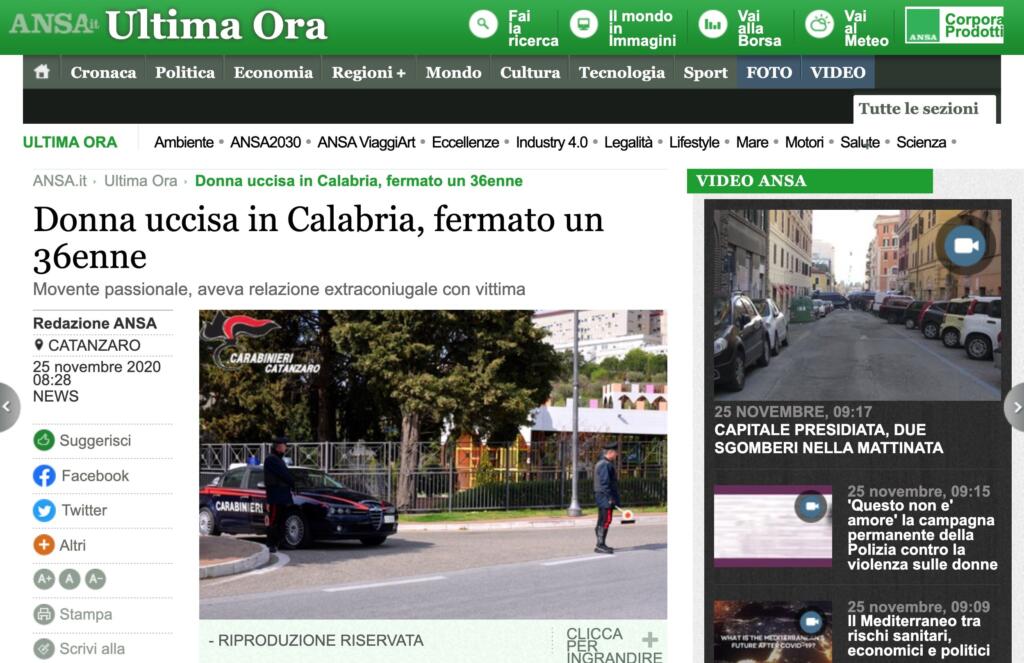 Sappiamo, conoscendo il metodo di lavoro dei colleghi dell’Ansa, che non ci sia stata alcuna intenzione di ‘minimizzare’ il fatto utilizzando una sorta di ‘causale’ che ha portato al femminicidio in Calabria. Ma ogni giorno ci si trova di fronte all’utilizzo sbagliato di parole. Ed ecco come viene raccontata questa vicenda di cronaca sul sito della principale agenzia di stampa italiana.