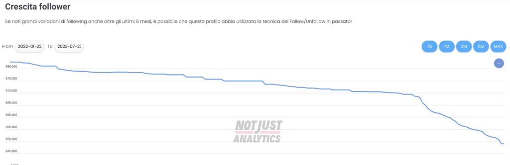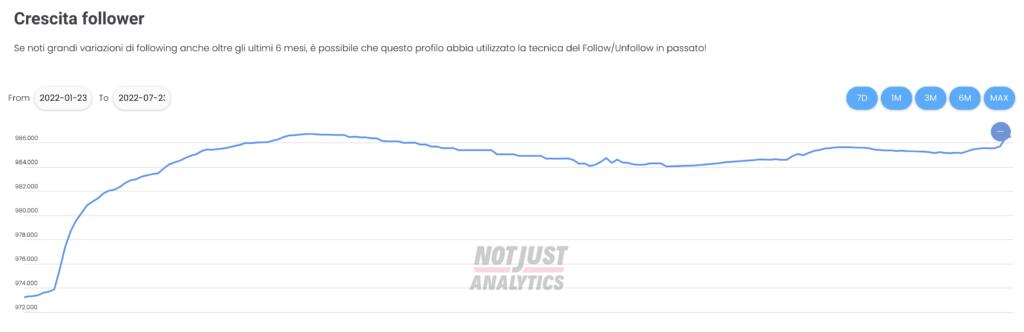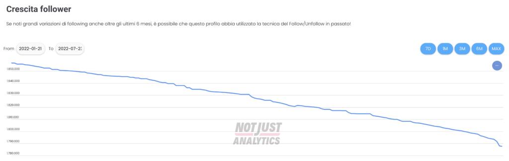 Per farlo abbiamo utilizzato una piattaforma online – Not Just Analytics – che riesce a fornire uno screening generale delle evoluzioni di ogni pagina pubblica su Instagram. C’è l’engagement rate (ovvero quel rapporto tra numero di follower e interazioni), ma soprattutto c’è il monitoraggio della crescita (o della decrescita, come accaduto per buona parte degli attori politici italiani) dei follower. Ovviamente questo significa poco (la tesi iniziale non si basa sui valori assoluti, ma sulla curva di crescita o decrescita del numero di follower), probabilmente meno dei sondaggi che si realizzano quotidianamente su campioni ridotti di cittadini. Ma è comunque una misura – vista l’importanza della comunicazione social – di come questi ultimi sei mesi abbiano segnato il passo per molti leader.