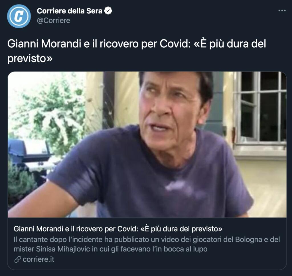 Il tweet, ora, non esiste più. Cancellato dopo le proteste dei lettori. Non si tratta di una bufala, ma di un errore – come si evince dal testo dell’articolo – nella pubblicazione social che contiene l’aggiornamento delle condizioni di salute del tanto amato cantate nato in provincia di Bologna. Venti minuti, questo il lasso di tempo in cui quel tweet è rimasto visibile sul profilo de Il Corriere della Sera con la notizia di Gianni Morandi ricoverato per Covid. Ma, ovviamente, non è così.