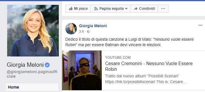 «Dedico il titolo di questa canzone a Luigi di Maio: “nessuno vuole essere Robin” ma per essere Batman devi vincere le elezioni», ha scritto Meloni. Un nuovo attacco dopo quello pubblicato subito dopo le consultazioni con la presidente del Senato Maria Elisabetta Casellati, dopo le quali Di Maio si era detto disponibile solo ad avere un appoggio esterno di Forza Italia e Fratelli d’Italia a un governo da lui presieduto.