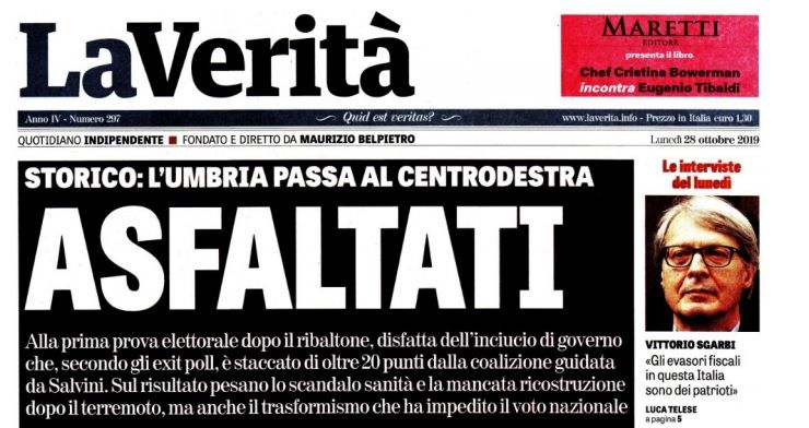 Un pizzico di fantasia non guasterebbe perché se capita una volta può esser considerato un caso, ma la seconda inizia a essere una cosa sospetta. Da due giorni – nel post vittoria della Lega, di Fratelli d’Italia e di quel che resta di Forza Italia in Umbria – Giornale e Verità sembrano aver scelto di pagare un titolista unico per entrambe le testate. Lunedì, infatti, l’apertura dei due quotidiani – ovviamente sullo schiacciante successo umbro del centrodestra – poteva esser prevedibile e anche giustificabile. Lo stesso caso, però, si è ripetuto a distanza di 24 ore. Stesso identico titolo.