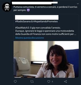 Ed ecco che, coadiuvati da un leader della Lega che ieri sara – non appena uscita la notizia della liberazione di Carola Rackete – ha fatto una diretta video su Facebook in cui ha messo alla berlina lo stesso gip Agrigento dicendole di svestirsi della toga e candidarsi in politica (senza dire ai suoi fan che quel decreto sicurezza è scritto talmente male che i paletti di legge sono aggirabili perché fanno a cazzotti con la realtà), è partita la caccia alla donna con il classico insulto e le minacce.