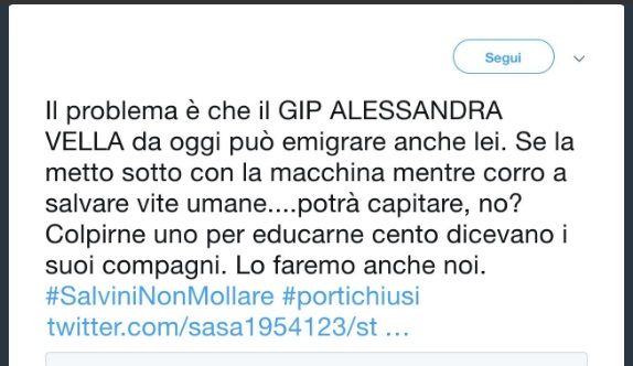 Sempre la solita storia. La via dell’insulto libero sui social è un fenomeno che non può essere messo a tacere, perché è dovere morale denunciare i continui atteggiamenti minatori di molti utenti che, sui social, si sentono liberi di insultare e minacciare chiunque non la pensi come loro. Dopo aver parlato questa mattina dei vergognosi commenti e ipotesi di complotto dopo l’attentato in Libia che ha portato alla morte di 40 persone nel centro di detenzione migranti di Tajoura, è necessario aprire una finestra su quel che è accaduto martedì sera, poco dopo le 20.30, alla notizia della mancata conferma degli arresti domiciliari della comandante di Sea Watch 3 Carola Rackete. E gli insulti, questa volta, non sono stati rivolti alla capitana, ma al Gip Agrigento che ha firmato la sua liberazione.