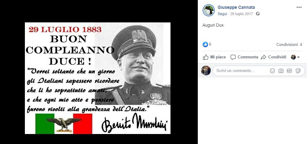 Per capire gli ideali politici di Giuseppe Cannata, 72enne medico, basta scorrere la sua timeline su Facebook. Tra i tanti post del consigliere di Fratelli d’Italia troviamo anche la bufala sul Pm di Agrigento Luigi Patronaggio e anche i tanti cari sentiti auguri a un personaggio come Benito Mussolini.