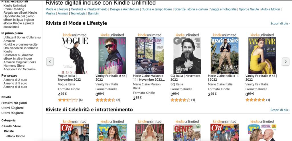 Riviste digitali, in formato e-book. Ovviamente i titoli sono acquistabili anche da chi non ha sottoscritto un abbonamento e all’interno del portale di Amazon sono indicati i costi per ciascuna copia. Ma chi ha l’abbonamento al servizio Kindle Unlimited avrà l’accesso a questa edicola digitale senza dover aggiungere ulteriori pagamenti al costo iniziale e già versato.