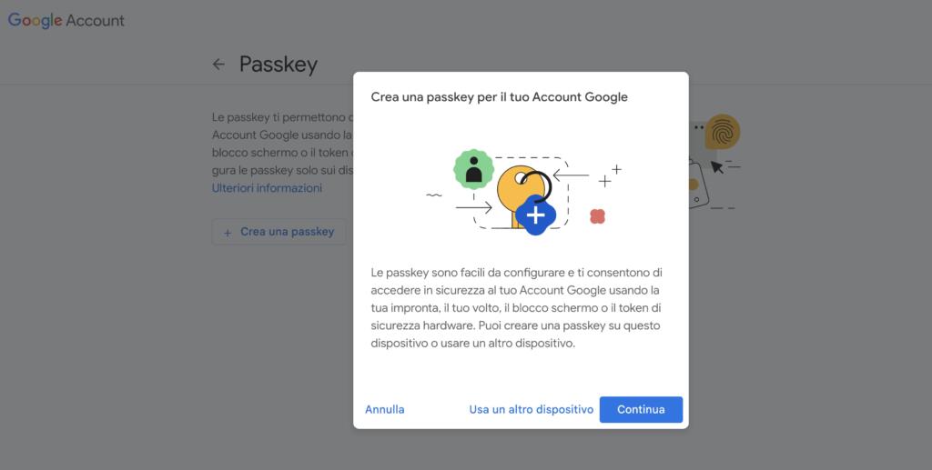 Ma come si crea questa passkey? Sarà necessario un veloce passaggio all’interno del proprio account Google dal dispositivo che si vuole utilizzare e seguire le istruzioni.